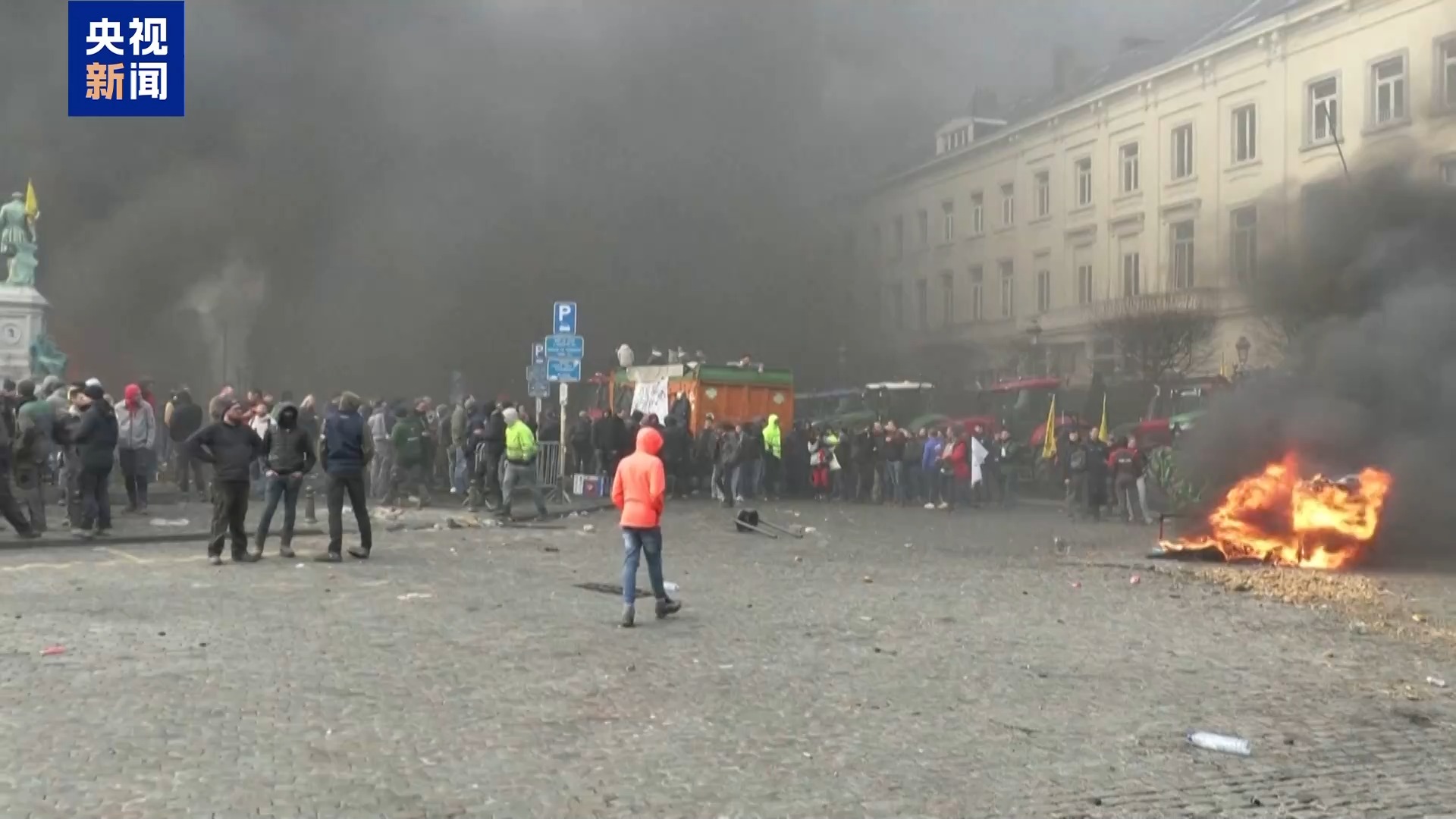 总台记者 顾鑫:在位于布鲁塞尔市中心的卢森堡广场,我们可以看到大量来自欧洲各地的农民驾驶拖拉机来到这里,抗议欧盟的相关政策。在现场他们燃烧垃圾并向警察投掷鞭炮和杂物,警方使用高压水枪和催泪瓦斯进行回应。整个现场弥漫着刺鼻的气味。
