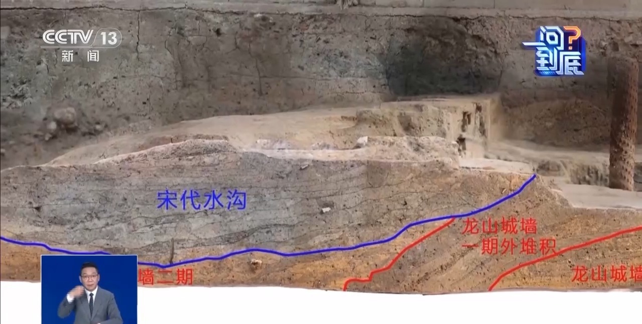 济南市考古研究院院长 郭俊峰:一期城墙是经过层层夯打起来的,里面夹杂了大量的料姜石,非常坚硬。一期城墙外侧是一期城墙时期龙山人倾倒的一些生活堆积物,这些堆积物之外是二期城墙,二期城墙规模更加宏大,二期城墙的土色相对纯净一点,它的里面掺杂了少量的黑色的淤泥。