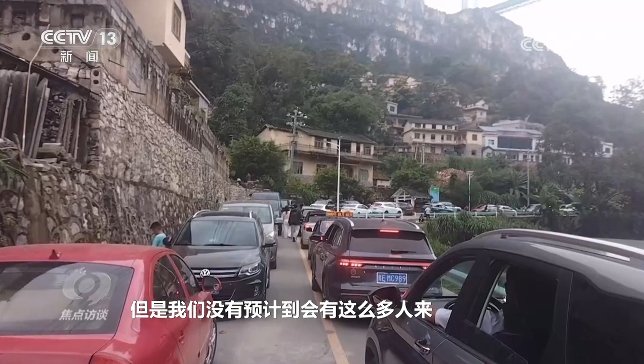 “十一”期间,每天有超过一万辆车陆续进入科力寨,进出科力寨的路口一度排起了长队,车辆一直拥堵到花江镇上。