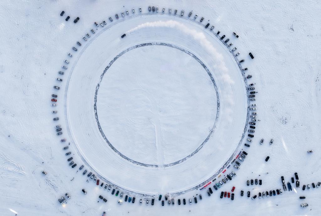 这是内蒙古冰雪英雄会现场的冰面漂移表演(无人机照片)。新华社记者 连振 摄
