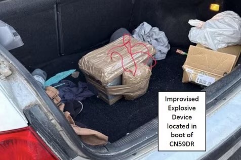 △法院公布图片:嫌疑人汽车后备箱里发现的简易爆炸装置