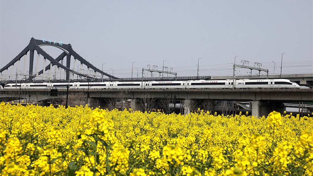 杭州:大片油菜花竞相绽放 高铁穿梭金色花海