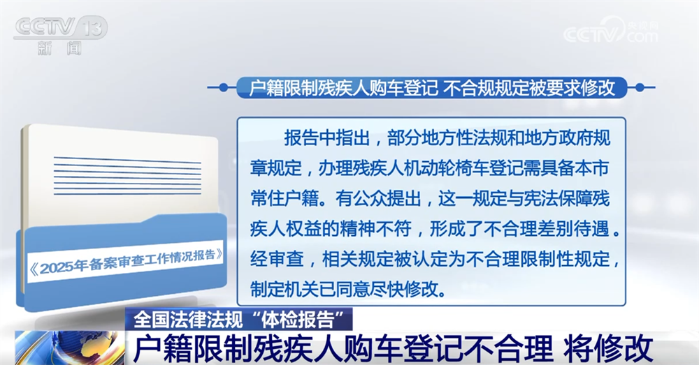 报告中指出,部分地方性法规和地方政府规章规定,办理残疾人机动轮椅车登记需具备本市常住户籍。有公众提出,这一规定与宪法保障残疾人权益的精神不符,形成了不合理差别待遇。经审查,相关规定被认定为不合理限制性规定,制定机关已同意尽快修改。