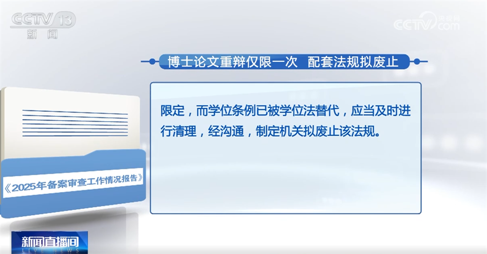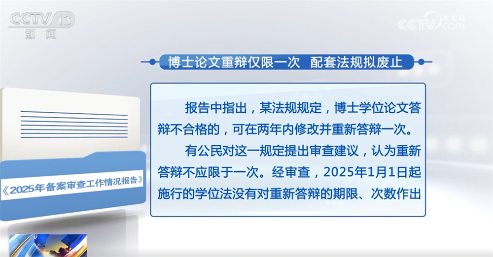 报告中指出,某法规规定,博士学位论文答辩不合格的,可在两年内修改并重新答辩一次。有公民对这一规定提出审查建议,认为重新答辩不应限于一次。经审查,2025年1月1日起施行的学位法没有对重新答辩的期限、次数作出限定,而学位条例已被学位法替代,应当及时进行清理,经沟通,制定机关拟废止该法规。