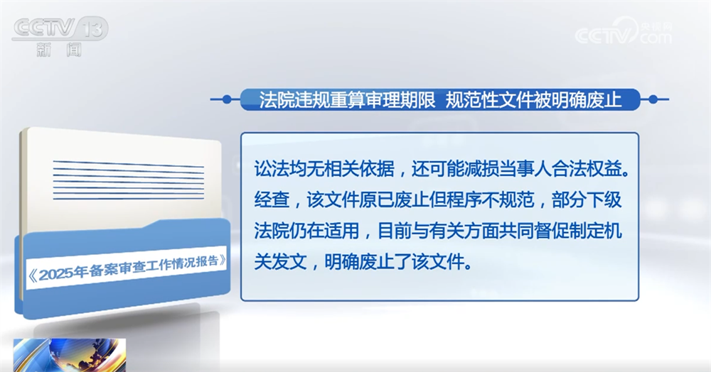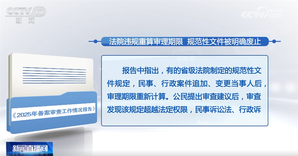 报告中指出,有的省级法院制定的规范性文件规定,民事、行政案件追加、变更当事人后,审理期限重新计算。公民提出审查建议后,审查发现该规定超越法定权限,民事诉讼法、行政诉讼法均无相关依据,还可能减损当事人合法权益。经查,该文件原已废止但程序不规范,部分下级法院仍在适用,目前与有关方面共同督促制定机关发文,明确废止了该文件。