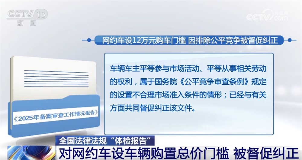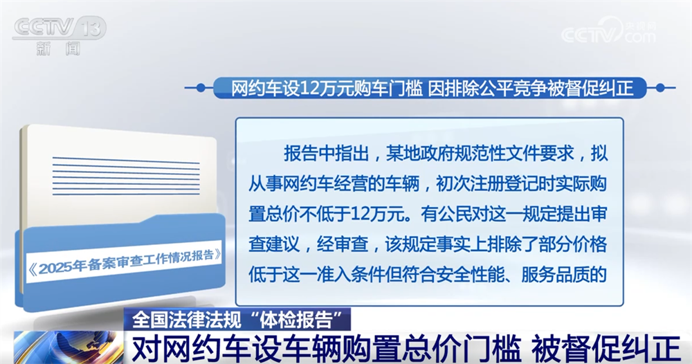 报告中指出,某地政府规范性文件要求,拟从事网约车经营的车辆初次注册登记时实际购置总价不低于12万元。有公民对这一规定提出审查建议,经审查,该规定事实上排除了部分价格低于这一准入条件但符合安全性能、服务品质的车辆车主平等参与市场活动、平等从事相关劳动的权利,属于国务院《公平竞争审查条例》规定的设置不合理市场准入条件的情形;已经与有关方面共同督促纠正该文件。
