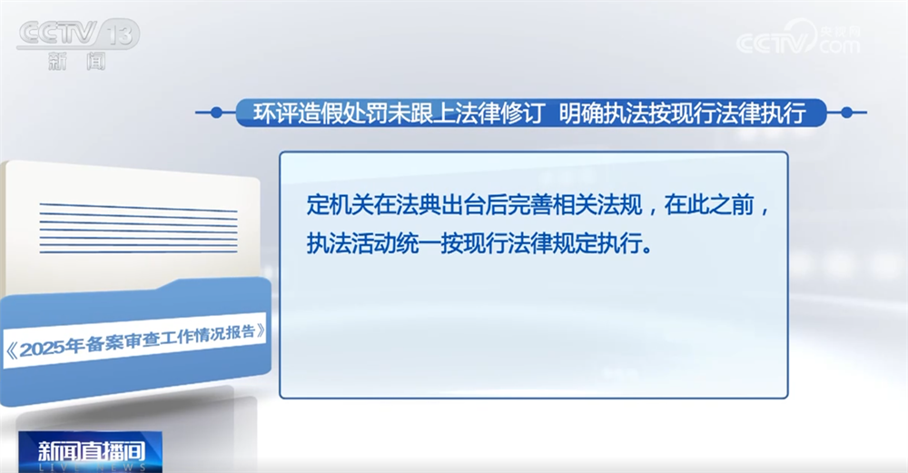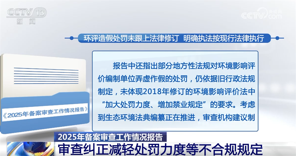 报告中还指出部分地方性法规对环境影响评价编制单位弄虚作假的处罚,仍依据旧行政法规制定,未体现2018年修订的环境影响评价法中“加大处罚力度、增加禁业规定”的要求。考虑到生态环境法典编纂正在推进,审查机构建议制定机关在法典出台后完善相关法规,在此之前,执法活动统一按现行法律规定执行。