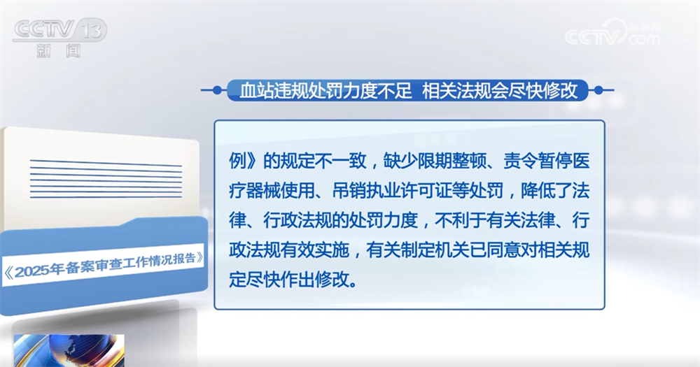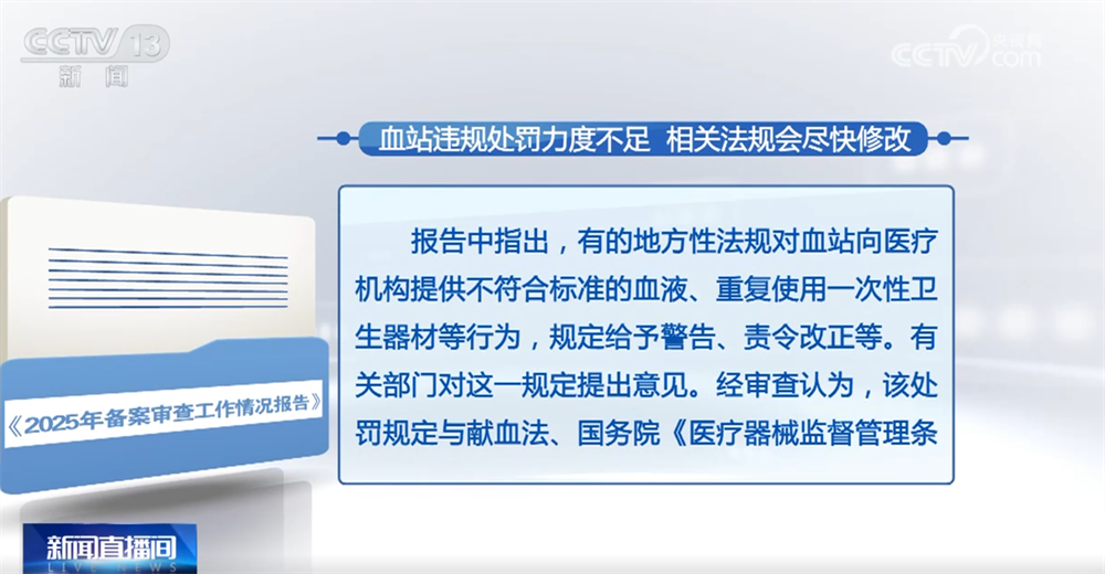 报告中指出,有的地方性法规对血站向医疗机构提供不符合标准的血液、重复使用一次性卫生器材等行为,规定给予警告、责令改正等。有关部门对这一规定提出意见。经审查认为,该处罚规定与献血法、国务院《医疗器械监督管理条例》的规定不一致,缺少限期整顿、责令暂停医疗器械使用、吊销执业许可证等处罚,降低了法律、行政法规的处罚力度,不利于有关法律、行政法规有效实施,有关制定机关已同意对相关规定尽快作出修改。