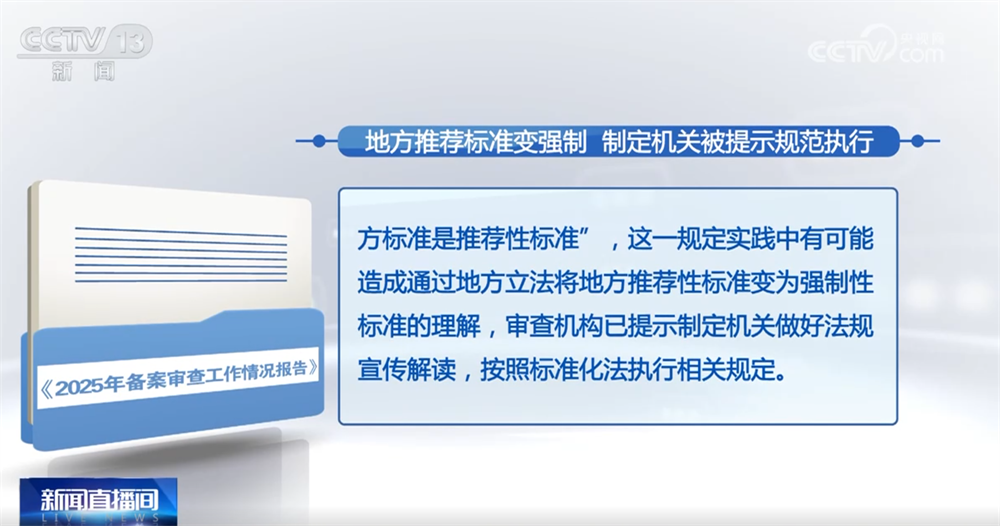 报告中指出,有的地方性法规规定,城市轨道交通运营单位应“统一规范设置”导向和服务标志,且需符合本市地方标准。有公民对这一规定提出审查建议,经审查,标准化法已明确“地方标准是推荐性标准”,这一规定实践中有可能造成通过地方立法将地方推荐性标准变为强制性标准的理解,审查机构已提示制定机关做好法规宣传解读,按照标准化法执行相关规定。