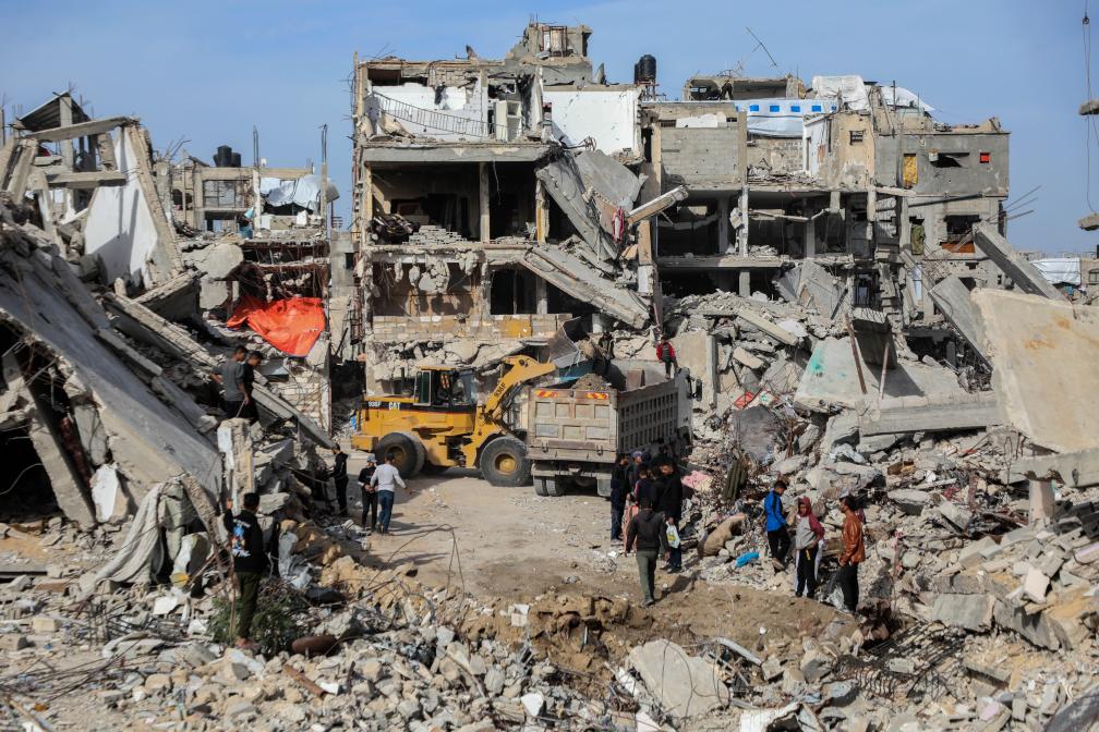 2025年12月8日,在加沙地带南部汗尤尼斯,遭空袭的建筑废墟被装车准备转运。新华社发(里泽克·阿卜杜勒贾瓦德摄)