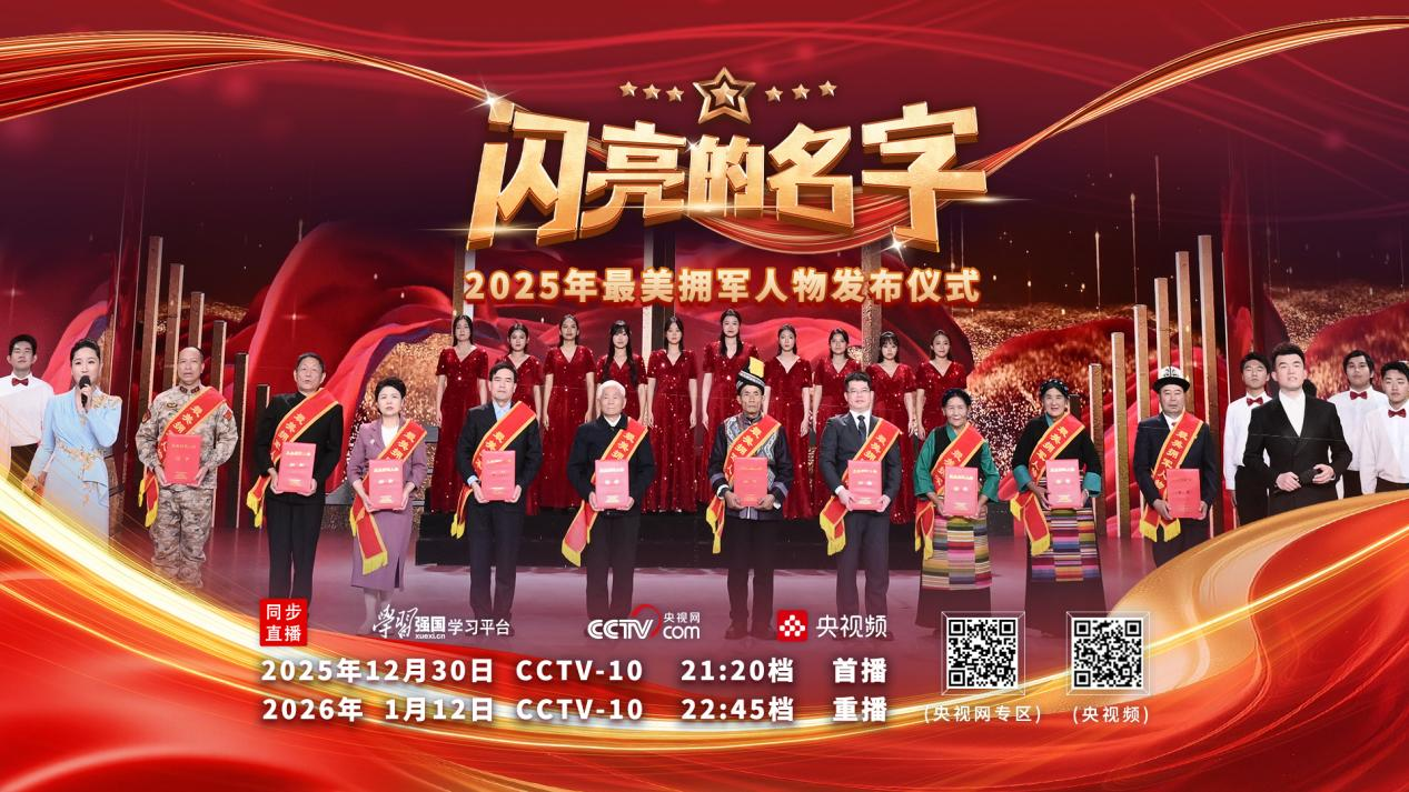 《闪亮的名字-2025年最美拥军人物发布仪式》将在中央广播电视总台央视科教频道(CCTV-10)12月30日21:20档 首播;2026年1月12日22:45档 重播。首播期间央视频、学习强国、央视网等新媒体平台同步直播。