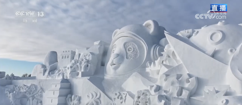 1月5日,哈尔滨室外的温度是零下18℃,虽然这里寒意正浓,但在太阳岛上却藏着最热烈的景致。大家看记者身后的这座巨型雪雕作品就是今年的主雪塑《点赞中国》,总长103米、宽20米、高33米,用雪量足足达到3万立方米,相当于600个标准集装箱的体积。站在它面前,能直观感受到冰雪艺术的恢宏气势。主塑的核心是一只身着航天服的大熊猫,将国宝形象与航天科技感完美融合,微微抬起的手构成了充满力量的“点赞”姿态。在大熊猫旁边,长城、大雁塔等标志性建筑清晰可见,让传统文化与科技成就在此形成奇妙的时空对话,每一处细节都凝聚着工匠的心血,以“点赞”姿态传递对祖国发展的自豪与赞颂。