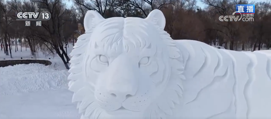 目前,所有艺术雪雕作品已全部完工,其中有一些作品是元旦期间刚刚亮相的。比如说《巨兽家园》,工匠们用巨型雪雕制作出了猫、虎、猩猩、鱼四种动物的形象,其中老虎雪雕是最大亮点。巨型雪老虎慵懒地趴卧在雪地上,工匠们精心雕琢的虎纹尽显王者风范,阳光洒落时,雪的冷冽与老虎的威猛完美相融。游客站在雪虎身旁,身形的渺小与老虎的庞大身躯形成鲜明反差,仿佛自己成了闯入雪域巨兽国度的小小访客。