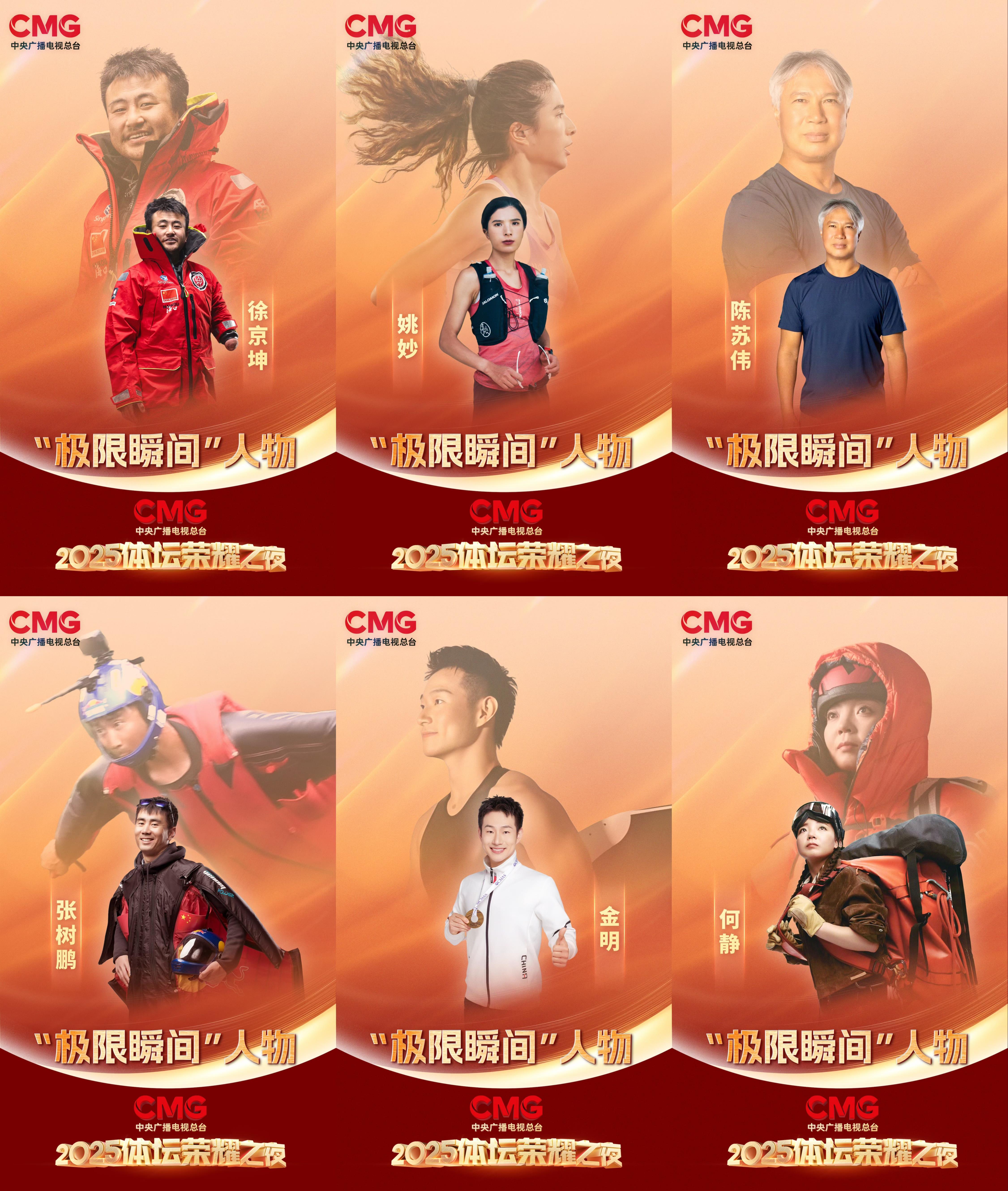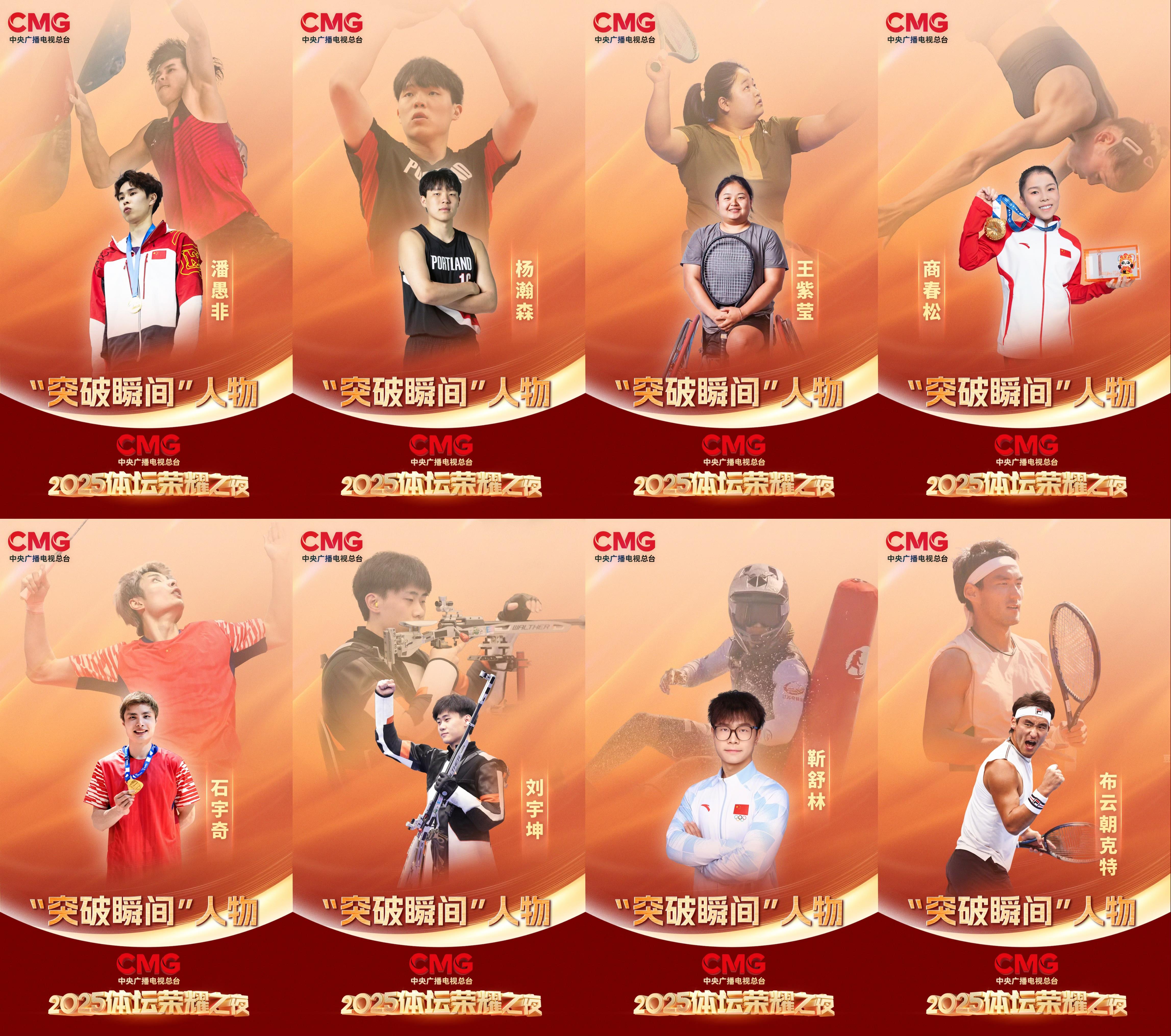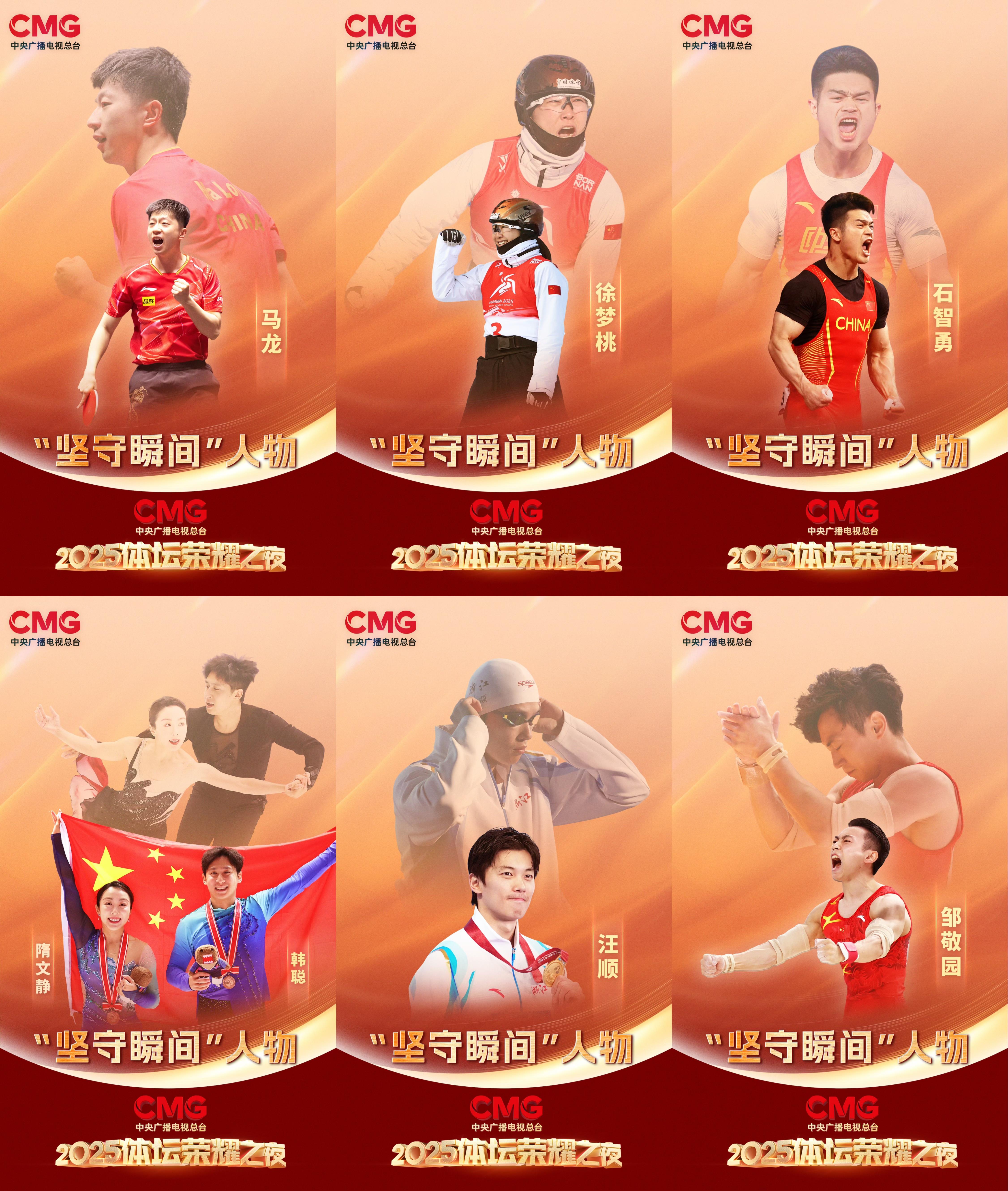 1月5日,2025中央广播电视总台体坛荣耀之夜在总台央视综合频道(CCTV-1)、体育频道(CCTV-5)黄金档播出。活动现场揭晓了“突破瞬间”“坚守瞬间”“新锐瞬间”“极限瞬间”“并肩瞬间”“闪耀之星”“致敬瞬间”“全民瞬间”8项荣誉,串联起中国体育的年度记忆,并设置 “跨越时间的对话”“相约粤港澳”“中华体育精神颂”等特别环节,致敬过去一年中国体坛的卓越成就。