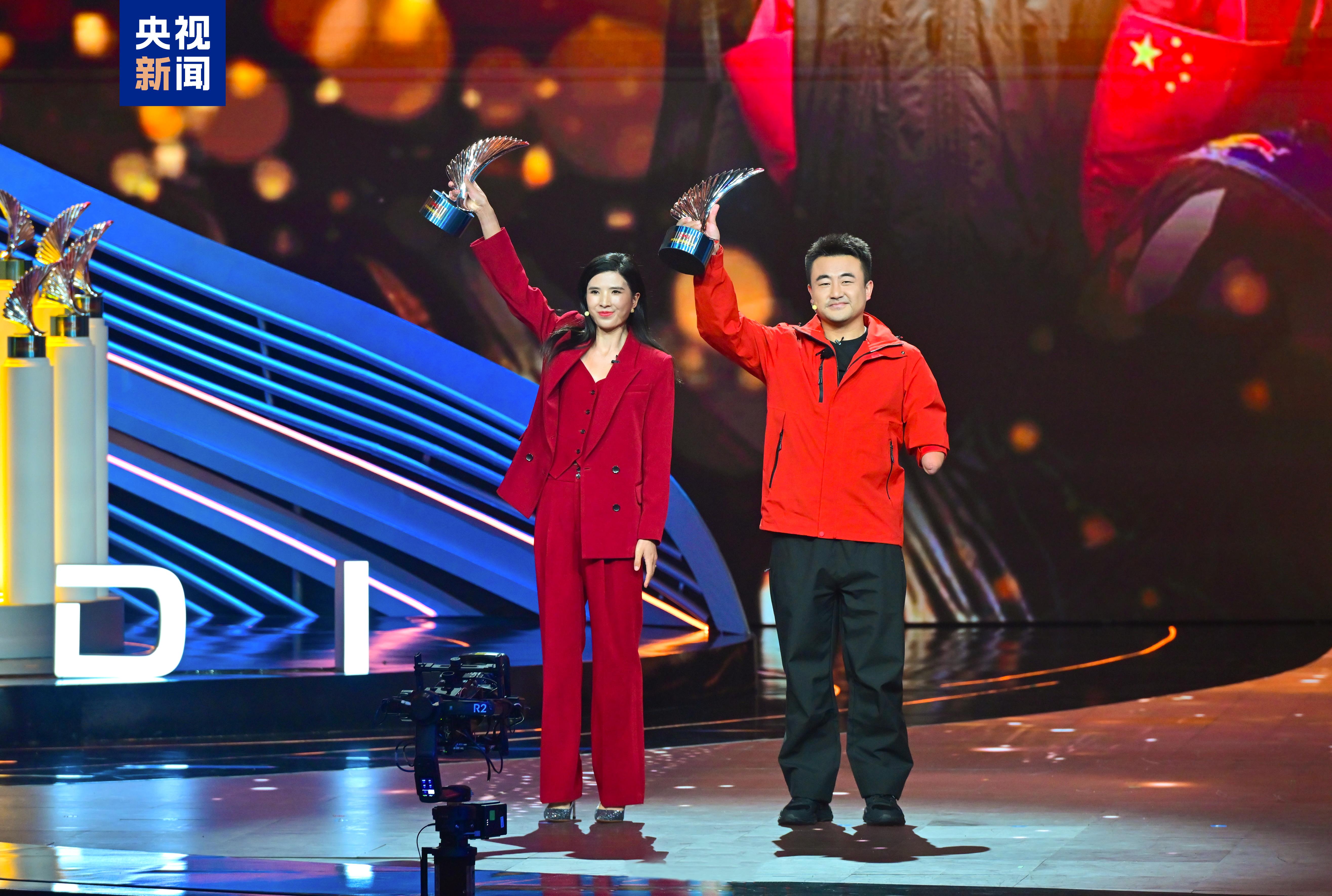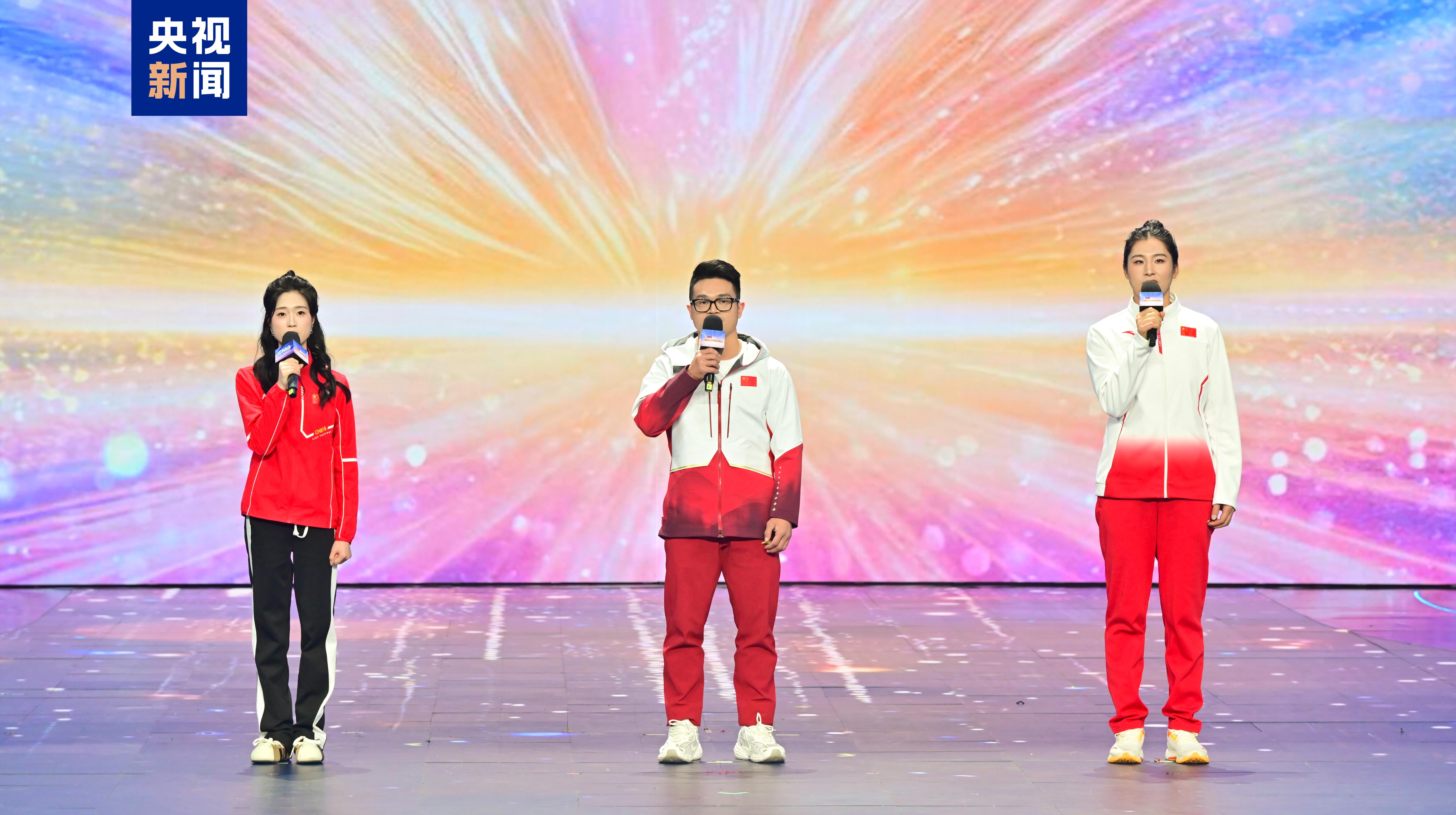 “中华体育精神颂”环节中,举重奥运冠军石智勇、射击奥运冠军黄雨婷和拳击奥运冠军李倩分享自己深入基层,讲好中国体育故事、弘扬中华体育精神的经历。