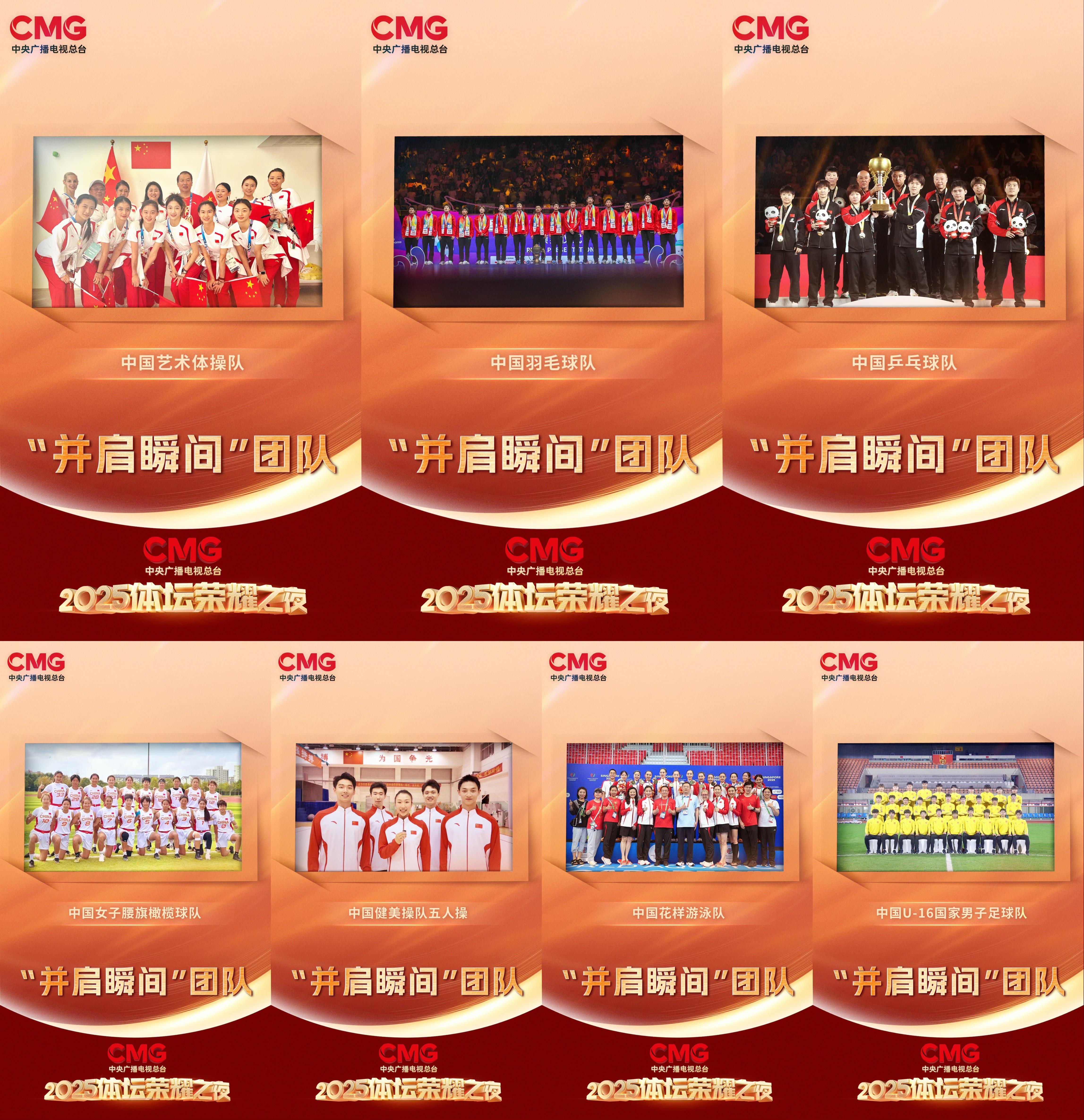 “并肩瞬间”致敬并肩作战的团队精神,获评的7支队伍均在国际赛场斩获佳绩:中国艺术体操队在世锦赛斩获集体5带金牌,中国羽毛球队连续第四次、历史第14次问鼎苏迪曼杯羽毛球混合团体冠军,中国乒乓球队实现国际乒联混合团体世界杯三连冠,中国女子腰旗橄榄球队获得亚洲大洋洲锦标赛总冠军,中国健美操队夺得世运会健美操五人操冠军,中国花样游泳队包揽世锦赛三枚集体金牌,中国U-16国家男子足球队在2026亚足联U17亚洲杯预选赛五连胜,晋级决赛阶段。