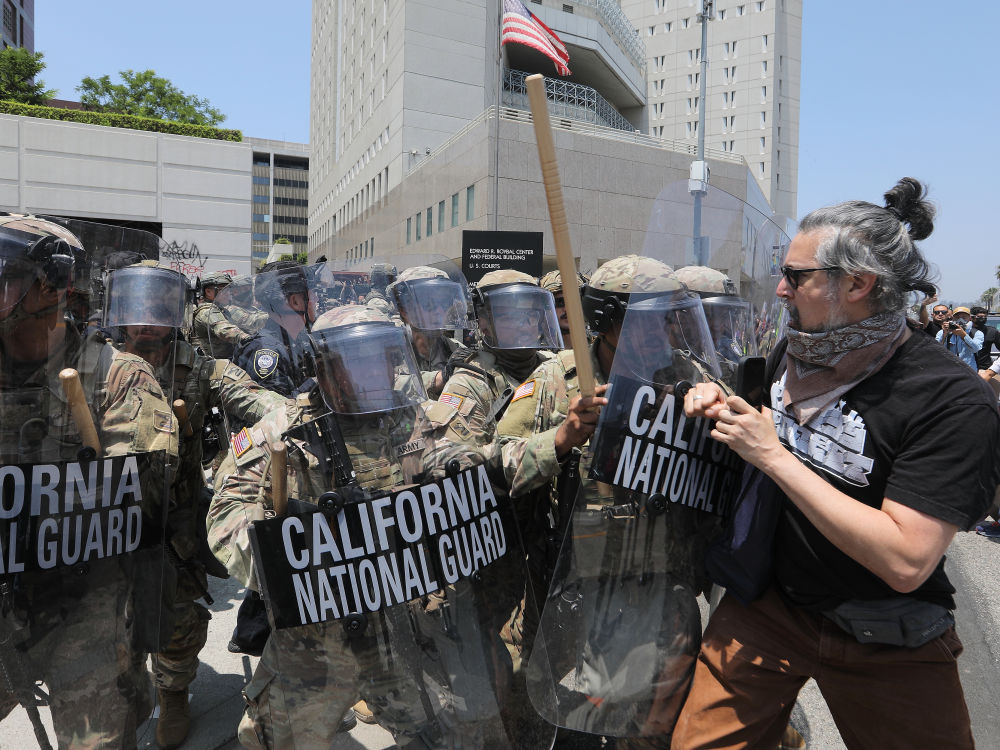 2025年6月8日,在美国加利福尼亚州洛杉矶市中心的联邦执法机构门前,抗议者与国民警卫队人员发生冲突。新华社发(邱晨摄)