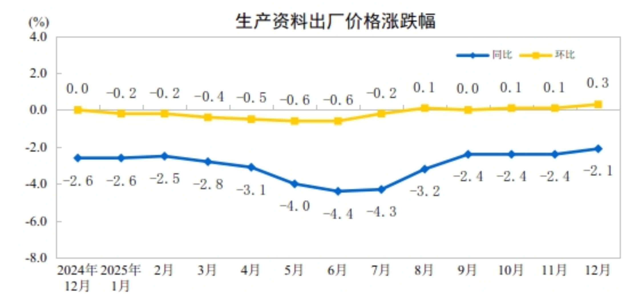央视网消息:据国家统计局网站消息,2025年12月份,全国工业生产者出厂价格同比下降1.9%,降幅比上月收窄0.3个百分点;环比上涨0.2%,涨幅比上月扩大0.1个百分点。工业生产者购进价格同比下降2.1%,降幅比上月收窄0.4个百分点;环比上涨0.4%,涨幅比上月扩大0.3个百分点。2025年全年,工业生产者出厂价格下降2.6%,工业生产者购进价格下降3.0%。