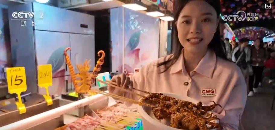 总台记者 叶帆:乘着高铁一路向南,我们来到了三亚,现在是在亚龙湾附近的一处夜市。可以看到现场已经非常的热闹了,走在其中也能闻见阵阵的食物香味。我们刚刚在这边烤的鱿鱼已经好了。我们接过来,现在来品尝一下,味道很美味,我们再去看看还有什么好吃的。