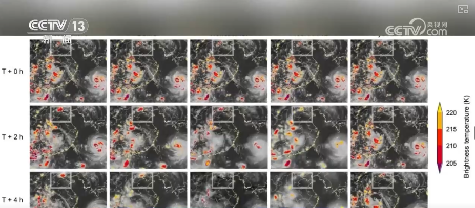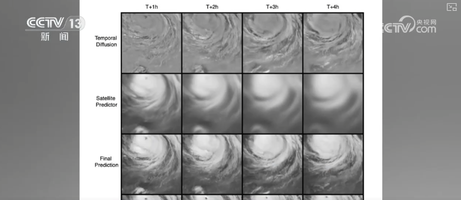风云气象卫星工程应用系统总设计师覃丹宇介绍,这是一个算法结果的示意图,在最上面这一行代表着预测时间在不同时刻就是未来3小时、4小时和真实观测的残差(估计值与观察值之间的差),中间这一行是代表着大尺度的预测结果,也是随时间逐渐的变模糊。加入扩散模型以后,这个细节就越来越丰富,代表3小时、4小时以后预测的时间仍然有丰富的一些细节。