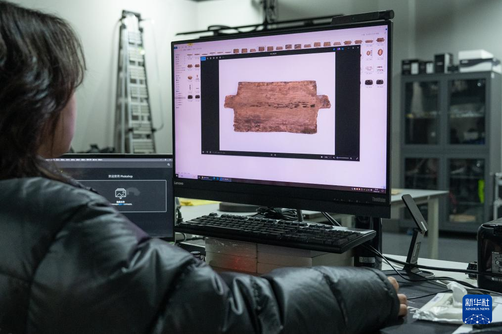 1月9日,在湖北荆州文物保护中心,工作人员查看文物照片。新华社记者 杜子璇 摄