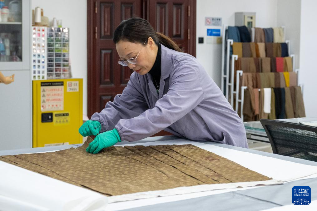1月9日,在湖北荆州文物保护中心,纺织品文物修复室负责人陈绍慧检查一件纺织品文物。新华社记者 杜子璇 摄