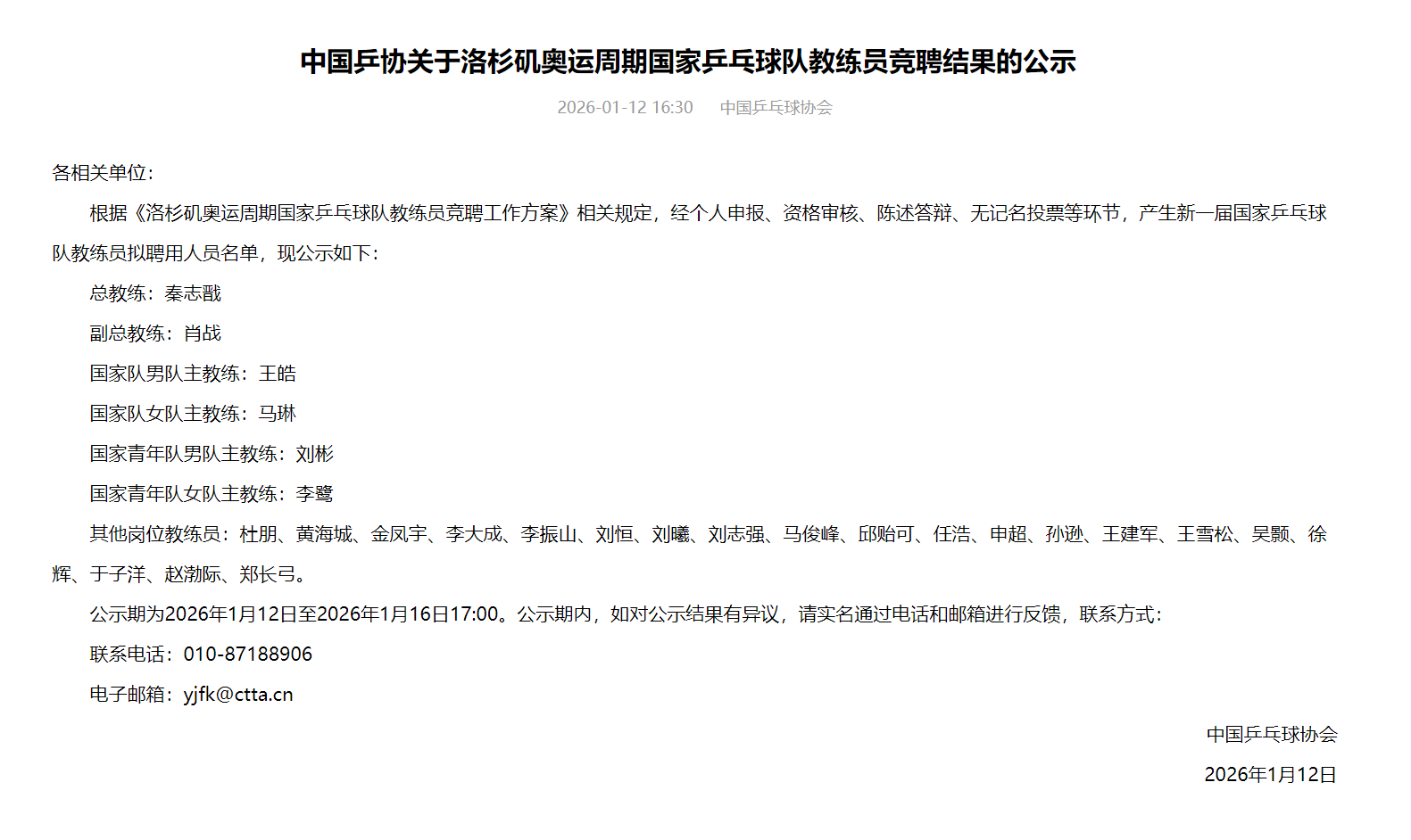 12日公示洛杉矶奥运周期国家乒乓球队教练员竞聘结果,拟聘秦志戬为总教练、肖战为副总教练、王皓为男队主教练、马琳为女队主教练。