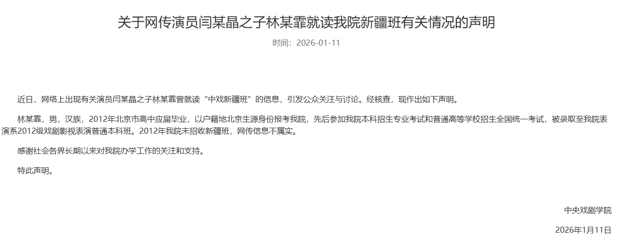 ·中央戏剧学院否认演员闫某晶之子就读“新疆班”:网传信息不属实。