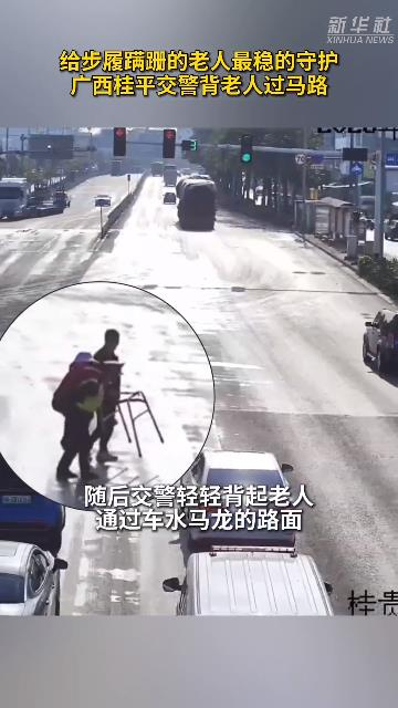 近日,广西桂平市一名老人在过马路时因腿脚不便,行动迟缓。执勤交警发现情况后,立即上前了解情况后,选择轻轻背起老人通过车水马龙的路面。为马路上最美“警”色点赞!