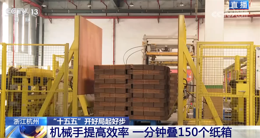 接下来,根据设计的图案印刷完成之后,通过工厂的智能物流系统,纸版就来到了成型生产线。原本一张张平铺的纸版,通过这台机器瞬间折叠,变成了折叠好的纸箱。这里模拟了人的手臂快速翻折的动作,过去这个工序是要靠人工一个个折叠的,现在就减轻了工人繁重的体力劳动。这里有一个屏幕,实时显示现在作业的效率,一分钟这条流水线能生产150多个纸箱,相当于不到1秒就有一个纸箱成品生产出来。通过物流线路自动运输到立体仓库,由叉车机器人扫码完成入库,高效精准。