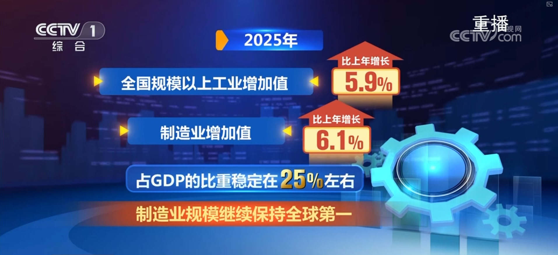 工业生产较快增长。2025年全国规模以上工业增加值比上年增长5.9%,制造业增加值比上年增长6.1%,占GDP的比重稳定在25%左右,制造业规模继续保持全球第一。