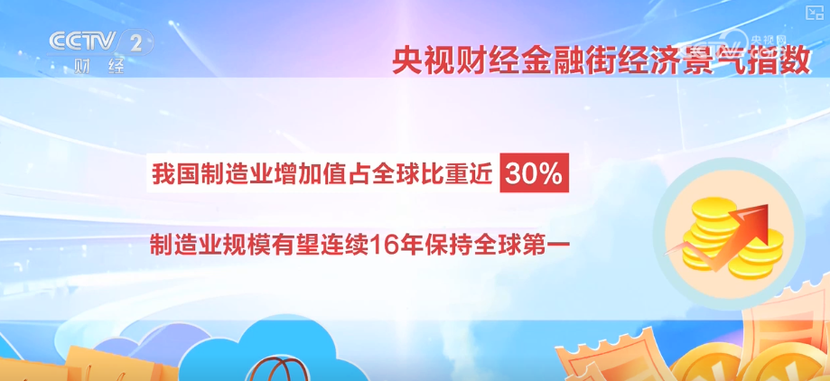 作为国内首个以金融视角展示中国经济景气程度的指数——“央视财经金融街经济景气指数”,2025年度指数为100.59点,表明市场预期稳中向好,中国经济正加速升级。其中,2025年全年,我国货物进出口总额同比增长3.8%,出口增长6.1%。我国制造业年内“量质齐升”,制造业增加值占全球比重近30%,制造业规模有望连续16年保持全球第一。