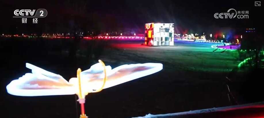 夜幕下,辽宁抚顺月牙岛的冰湖化身一处巨大的“冰封舞台”,设置在冰面上的12米高裸眼3D立方体,循环播放着冰雪主题动画。