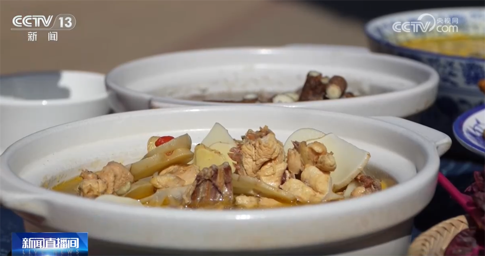 除了涨知识,来到百草村,地道美食可不容错过,这个是黄精炖鸡,这是当归羊肉,尝一口,没有羊肉的膻味,只有醇厚的香甜。亲手制作专属纪念品也成为亲子互动、学生研学的热门环节,大家可以制作自己的专属香囊,设计创作像素版草药花等装饰周边,模样别致,不管是自留还是送人都很有纪念价值。