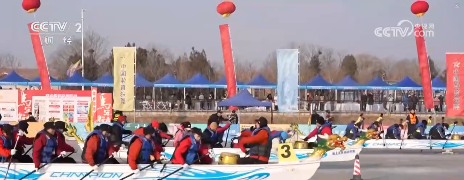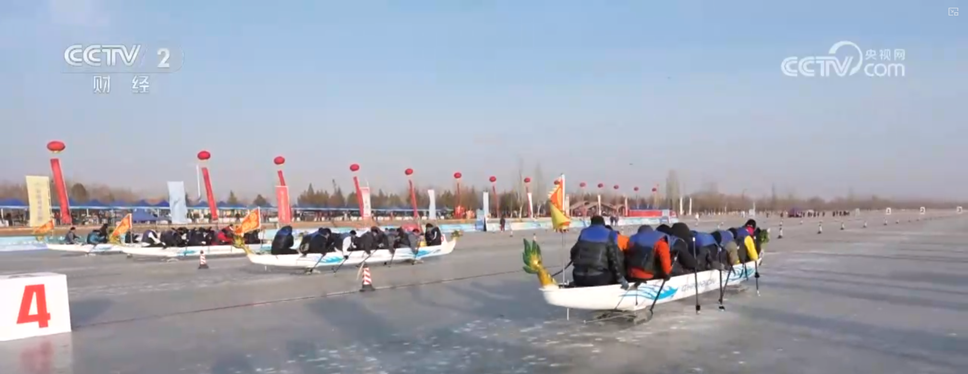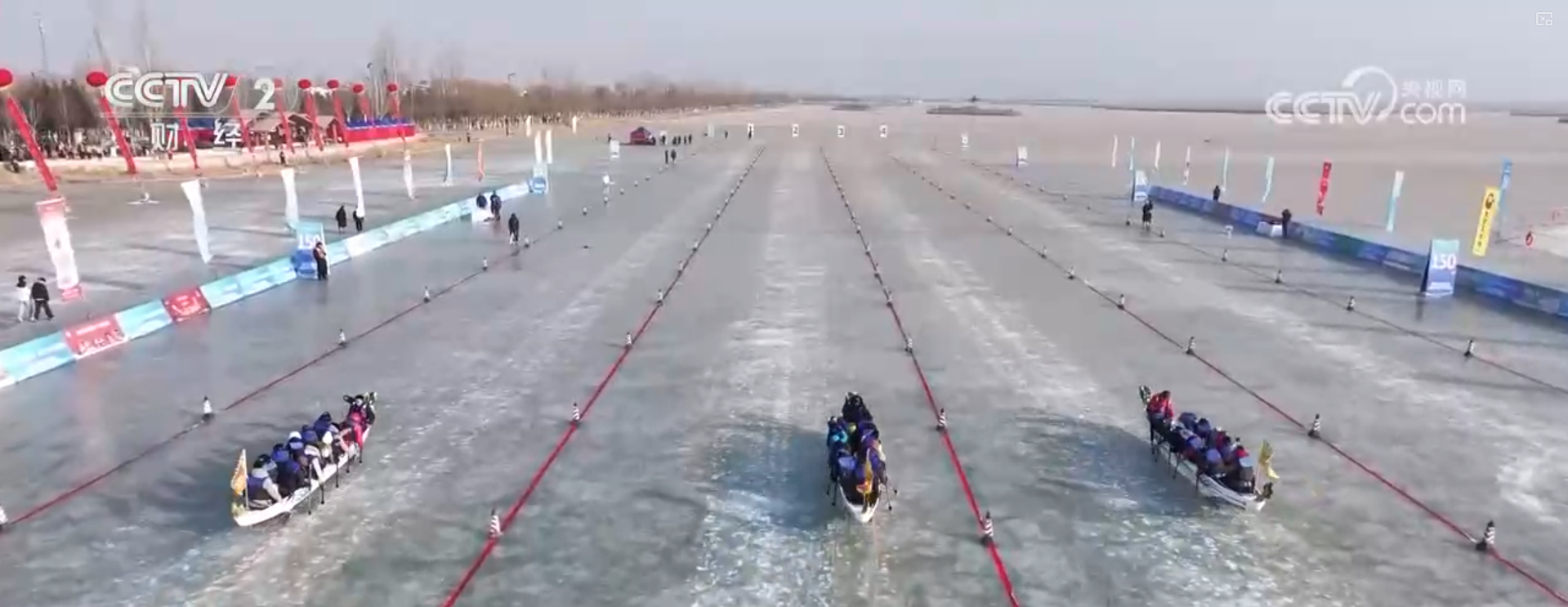 随着裁判员一声令下,冰上龙舟比赛正式开始。在长7.4米,宽1.2米的龙舟上,12名来自各行各业的选手们极速向前,多支队伍同场竞技、你追我赶,在冰面上激烈角逐。
