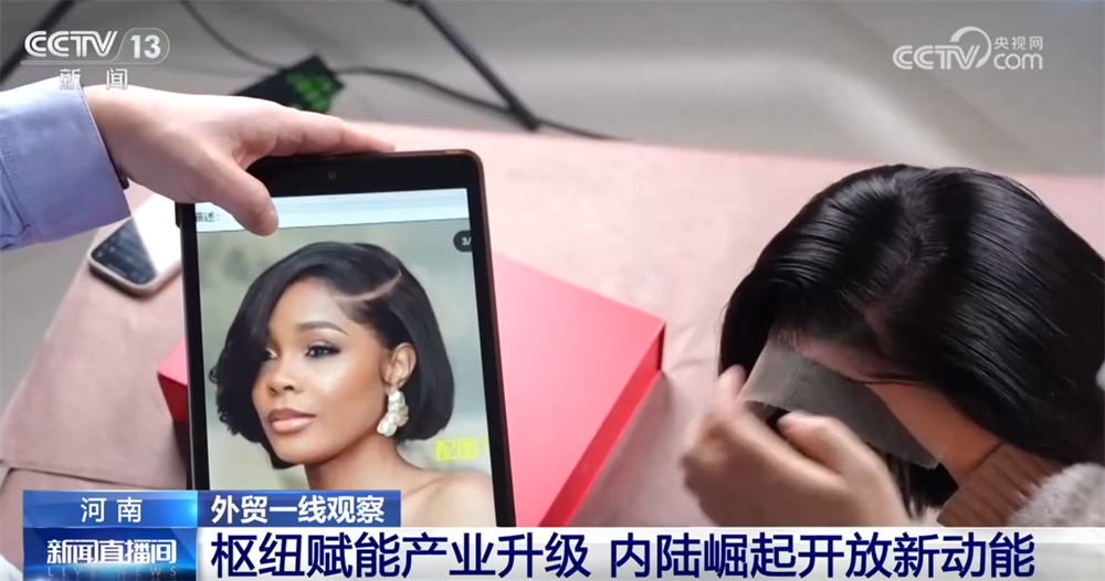 在许昌市的一家假发制品生产企业,主播正通过海外社交平台直播展示假发“十秒换颜”的效果,屏幕另一端是来自世界各地的消费者。