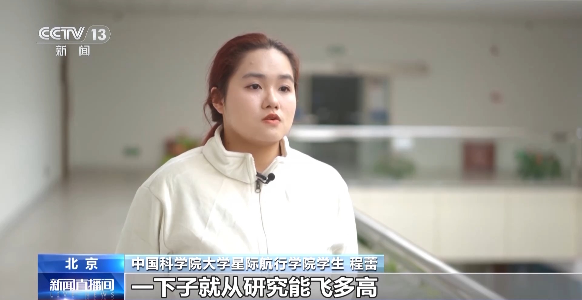 中国科学院大学星际航行学院学生 程蕾:感觉我们的视野一下子就从研究能飞多高,变成了我们要飞向多远。我们之前更多是研究地月方面的工程,未来我们要更多地探索未知的宇宙,有可能是扩展到太阳系甚至更长远的深空探索。