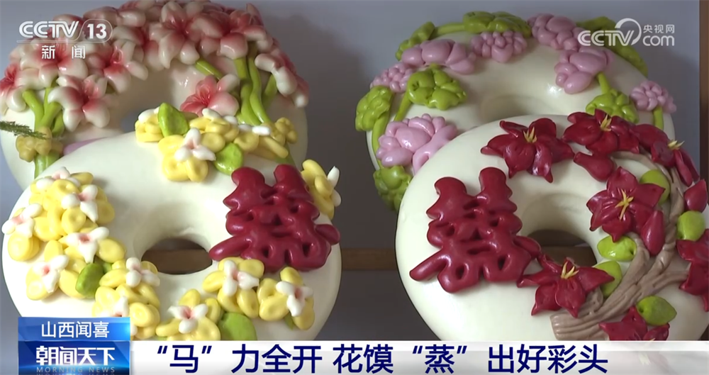 在闻喜县的这家花馍工坊里,店主樊殊伯正在制作花馍,他将马元素融合在了花馍的设计中,造型美观、寓意吉祥。