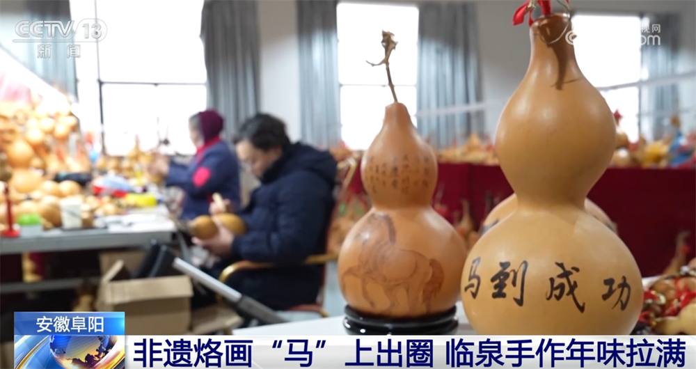 在临泉县这家工艺品公司的厂房里,手艺人们正在凝神创作葫芦烙画。临泉葫芦烙画是安徽省级非物质文化遗产,今年,以马元素为主题的图案成为了绝对主角。创作者手握电烙笔,在葫芦表面细致勾勒出各种马的生动造型。