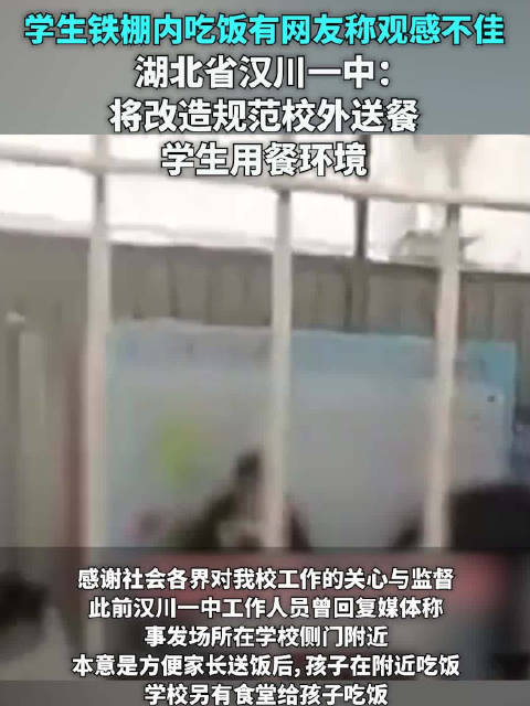 ·学生铁棚内吃饭,有网友称观感不佳。湖北汉川一中:将改造规范校外送餐学生用餐环境。