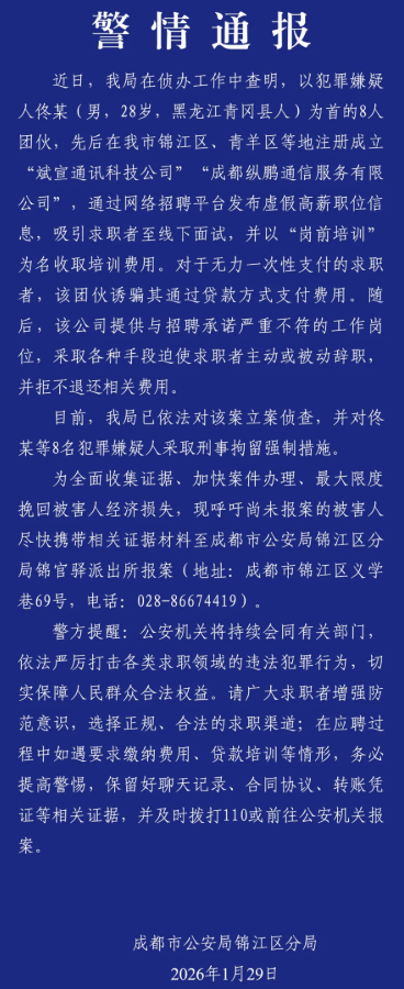 ·虚构高薪职位诱骗培训费,成都警方:对8人采取刑事拘留强制措施。