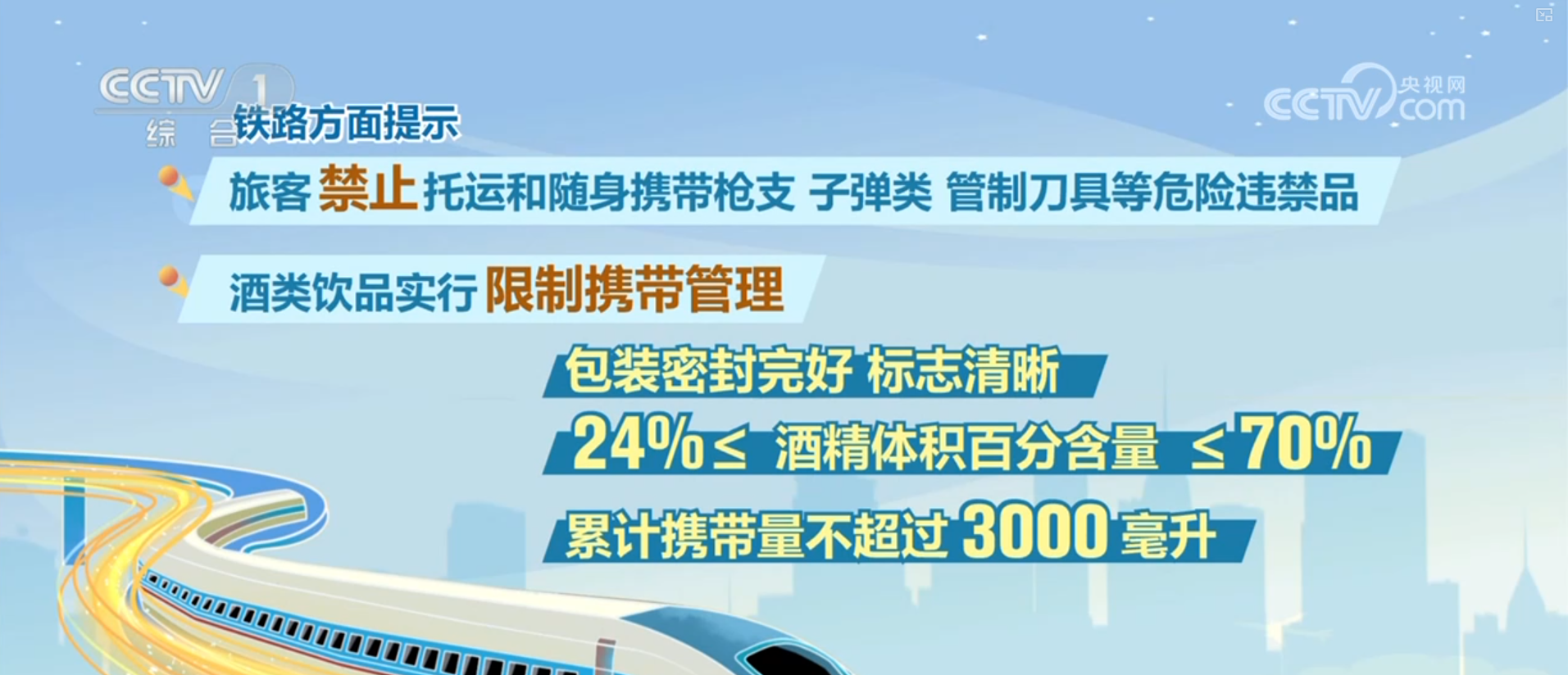 春运出行,平安为先。铁路方面提示,旅客禁止托运和随身携带枪支、子弹类,管制刀具等危险违禁品;酒类饮品实行限制携带管理,包装密封完好、标志清晰且酒精体积百分含量大于或者等于24%、小于或者等于70%的品类,累计携带量不超过3000毫升。建议广大旅客出行前登录12306官网或App,仔细查阅铁路禁止、限制携带物品详细目录。出行前多一份细致检查,既是遵守铁路规定,也是对自身和同行旅客的安全负责,让平安相伴春运旅途。