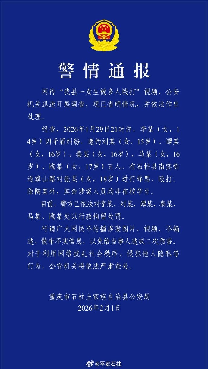 正在阅读:重庆石柱县一女生疑被多人拳打脚踢?警方:6人被行政拘留