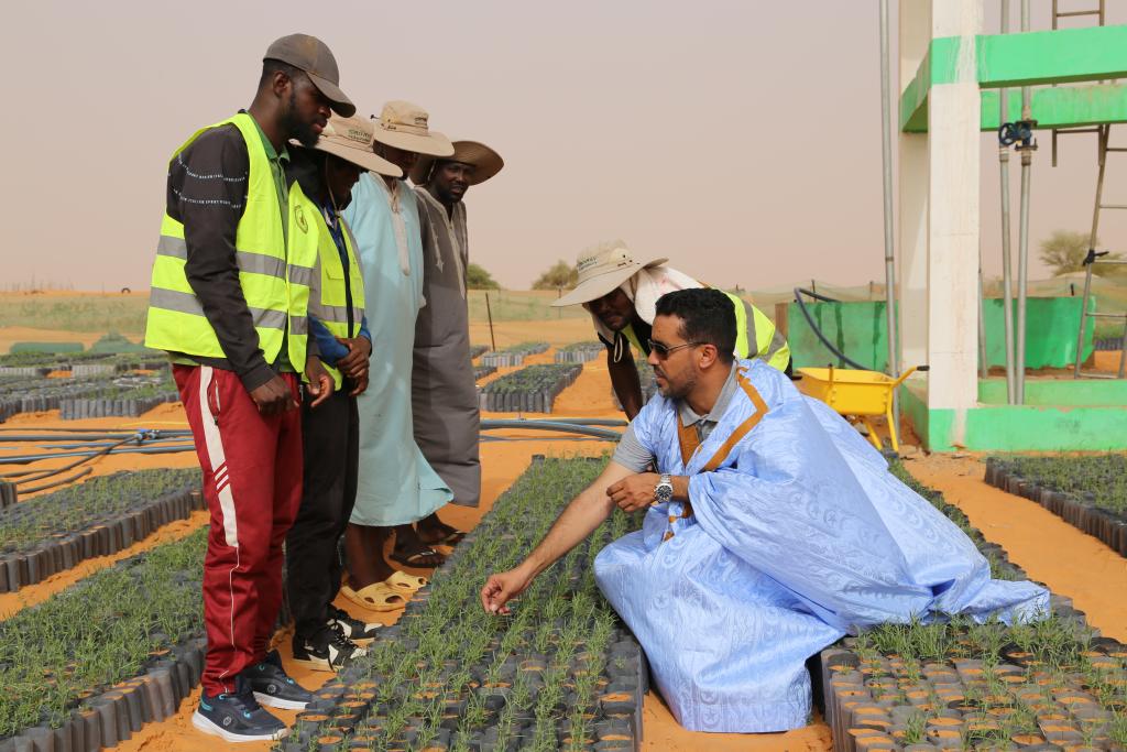 2025年5月22日,在毛里塔尼亚西部特拉扎区比尔·巴尔卡村,中非绿色技术公园毛里塔尼亚示范项目毛方协调员图拉德·迈杜向工人传授固沙植物种植技术。新华社记者 司源 摄
