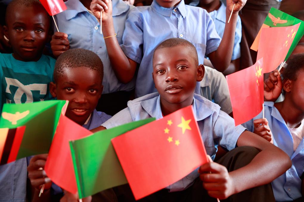 这是2019年6月13日,在赞比亚卢萨卡省琼圭区,手持中赞两国国旗的儿童参加中国援非“万村通”赞比亚项目竣工仪式。新华社记者 彭立军 摄