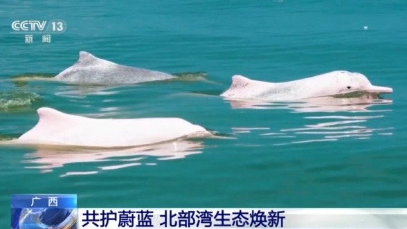 这是中华白海豚,是国家一级保护野生动物,它们幼年通体铅灰色,成年后变成白色或浅粉色,2008年被列入世界自然保护联盟濒危物种红色名录。广西钦州的三娘湾,是它们生活的一片固定海域。