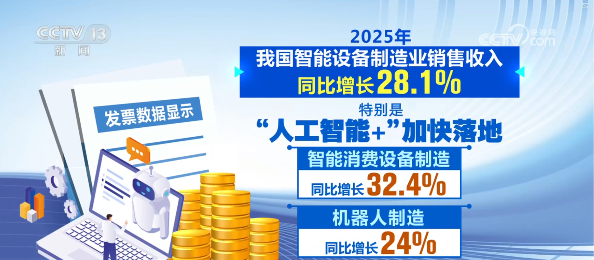 发票数据显示,2025年,我国智能设备制造业销售收入同比增长28.1%,特别是“人工智能+”加快落地,智能消费设备制造、机器人制造同比分别增长32.4%和24%。