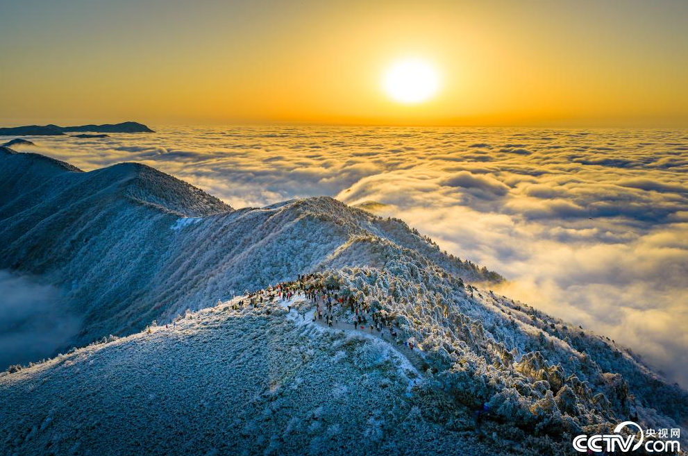杭州临安太子尖迎来冬日奇观,雪覆山巅,云海翻涌,朝阳破晓,金光洒满天际。