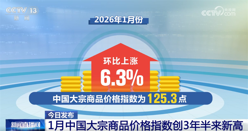 央视网消息:中国物流与采购联合会2月5日公布1月份中国大宗商品价格指数。从指数运行情况看,企业预期保持乐观,生产活动延续扩张态势,大宗商品价格指数连续九个月环比上涨,创下三年半以来新高。