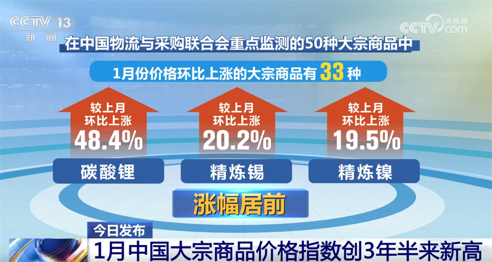 2026年1月份中国大宗商品价格指数为125.3点,环比上涨6.3%。在中国物流与采购联合会重点监测的50种大宗商品中,1月份价格环比上涨的大宗商品有33种。其中,碳酸锂、精炼锡和精炼镍涨幅居前,较上月环比分别上涨48.4%、20.2%和19.5%。
